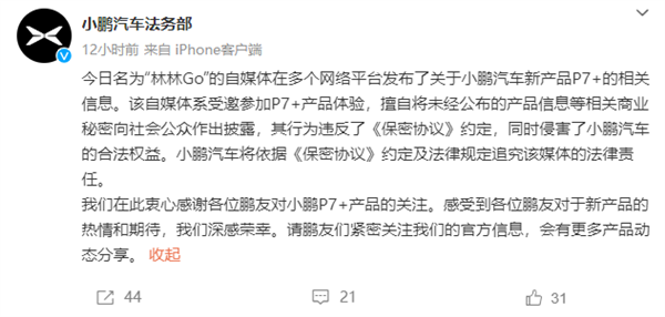 昨晚,小鹏汽车法务部发布声明,指出自媒体账号“林林Go”在多个平台上提前泄露了小鹏汽车新产品P7+的相关信息,违反了《保密协议》。小鹏汽车表示,该自媒体受邀参加了P7+的产品体验,但未经允许公开披露了未发布的商业机密,侵害了小鹏汽车的合法权益,法务部将依据相关协议和法律规定追究其责任。